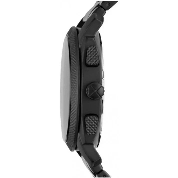 This 45 mm fossil features a black dial, chronograph movement and full black metal strap