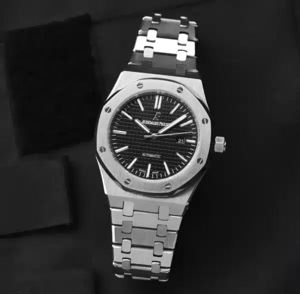 stainless steel octagonal face baton dial baton hands date indication screw-down crown adjustable link bracelet concealed clasp fastening automatic movement